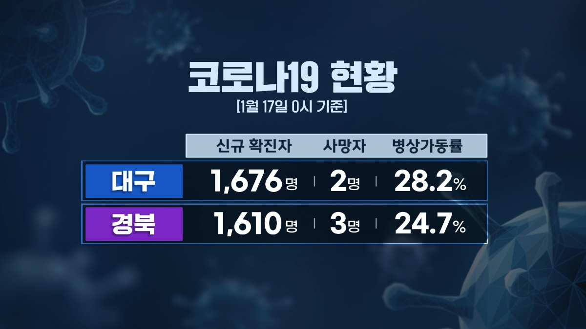 1월 17일 0시 기준 신규 확진자는 대구 1,676명으로 지난주 같은 요일보다 722명, 30.1% 줄었습니다.