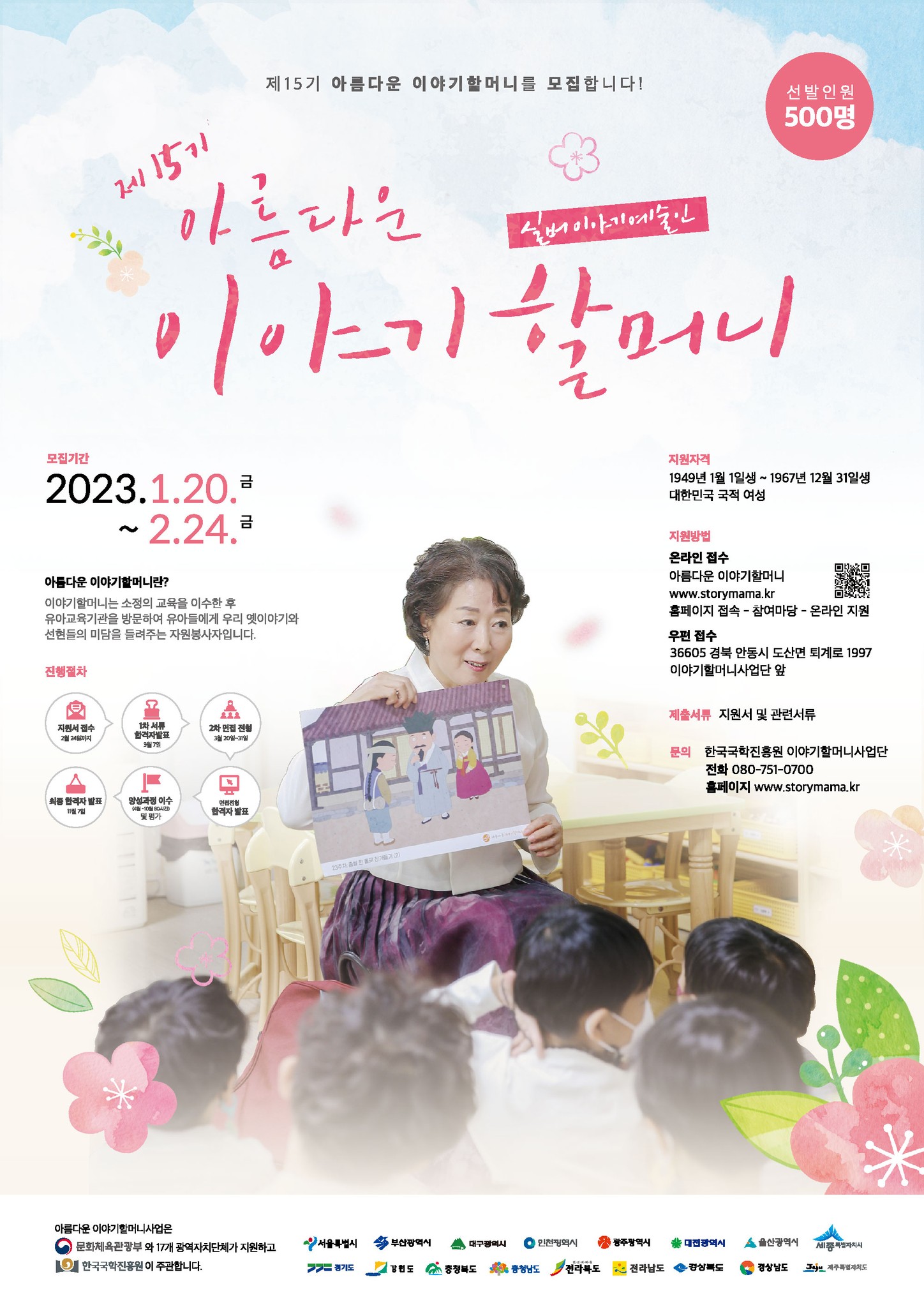 문화체육관광부가 한국국학진흥원과 함께 2023년 이야기 할머니 500명을 선발합니다.
