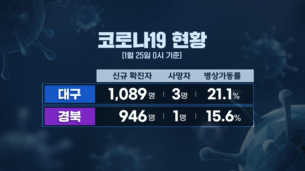 1월 25일 0시 기준 코로나 19 신규 확진자는 대구 1,089명, 경북 946명으로, 지난주 같은 요일에 비해 대구는 651명, 경북은 813명 줄었습니다.