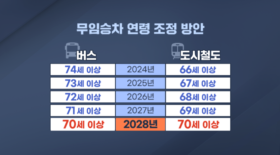 해마다 대상 나이를 한 살씩 낮추거나 높여서 오는 2028년에는 대구 시내버스와 도시철도 모두 70세 이상 무임승차 하는 쪽으로 맞출 예정입니다.