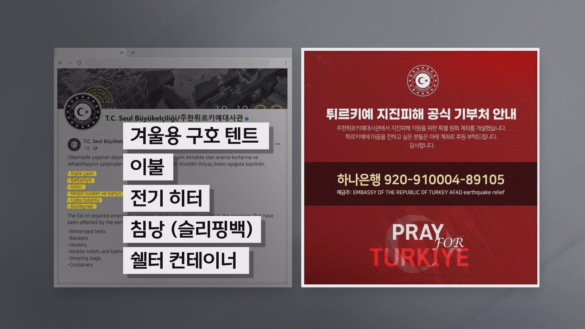 주한 튀르키예 대사관은 공식 SNS에 필요한 구호 물품 목록과 계좌를 올려놨습니다.