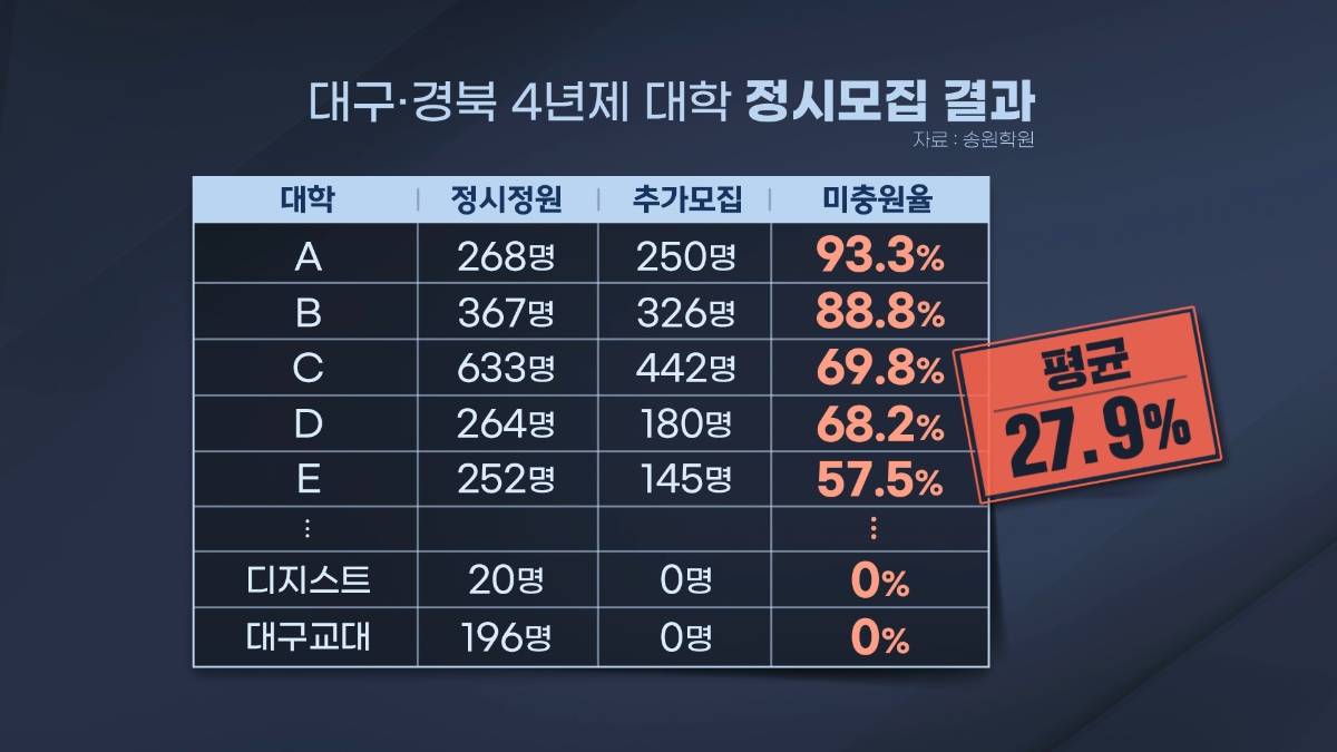 이 두 대학을 포함해 대구·경북 7개 대학은 미충원율 10% 이하를 기록했습니다.