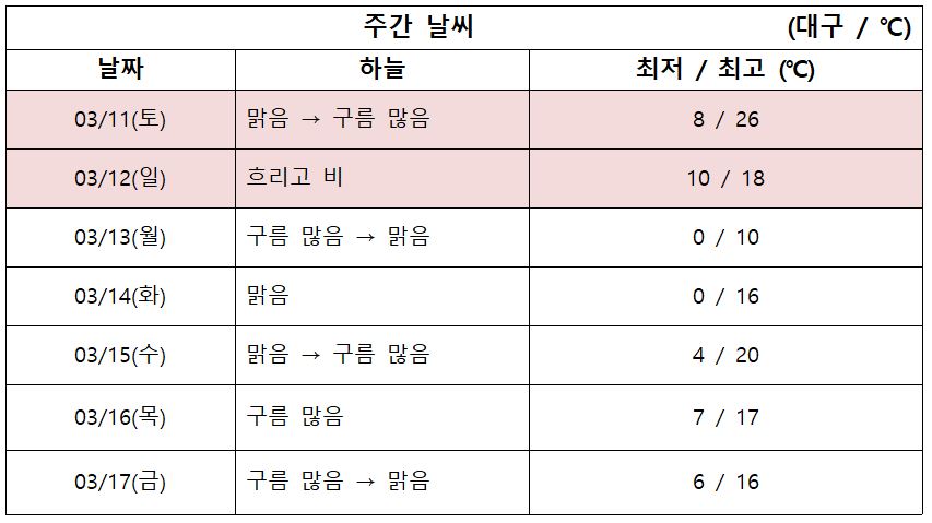 다만 일요일 오전부터 대구와 경북에는 비가 내리기 시작하겠고요.