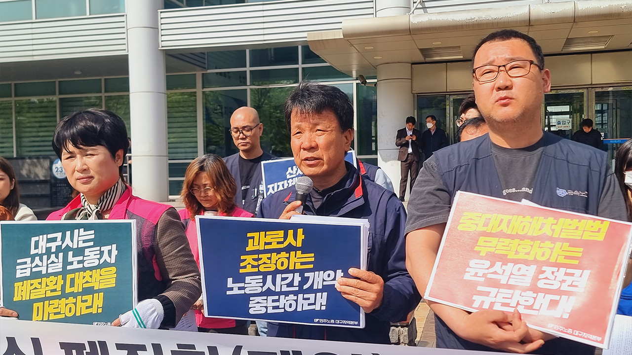 민주노총 대구지역본부는 4월 4일 대구지방고용노동청 앞에서 기자회견을 갖고 대구시와 8개 구·군, 산하 기관 등 구내식당이 있는 공공부문 51개 기관, 298명에 대한 폐 질환과 급식실 근무 환경 조사를 촉구했습니다.