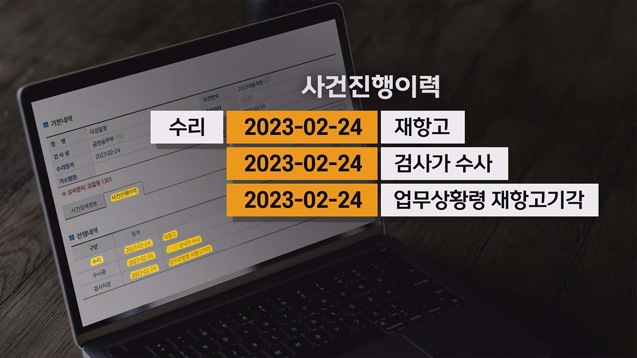 하지만 대검찰청의 사건 진행 이력을 보면 2023년 2월 24일 재항고 사건이 수리되었고 같은 날 수사 검사가 정해졌지만 당일 바로 기각 처리한 것으로 나와 있습니다.