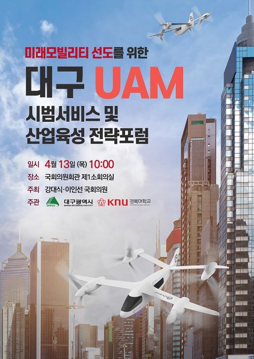 대구시는 4월 13일 국회 의원회관에서 강대식, 이인선 국회의원과 공동으로 'UAM, 즉 도심 항공교통 지역 시범 서비스 및 산업 육성 전략' 포럼을 엽니다.