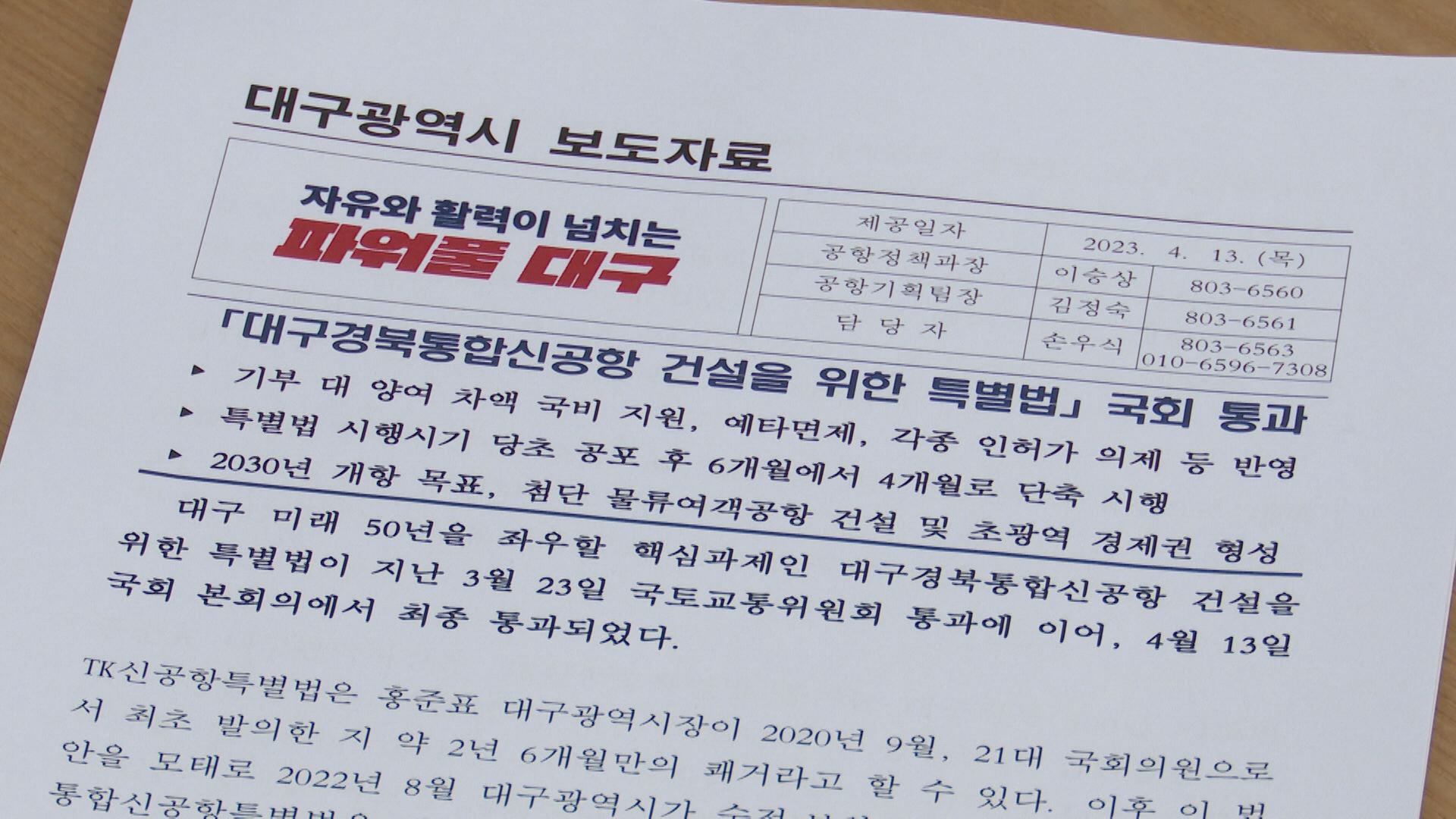 특별법 통과에 이은 대구시가 정부를 상대로 후속 작업을 해야 한다는 얘기죠?