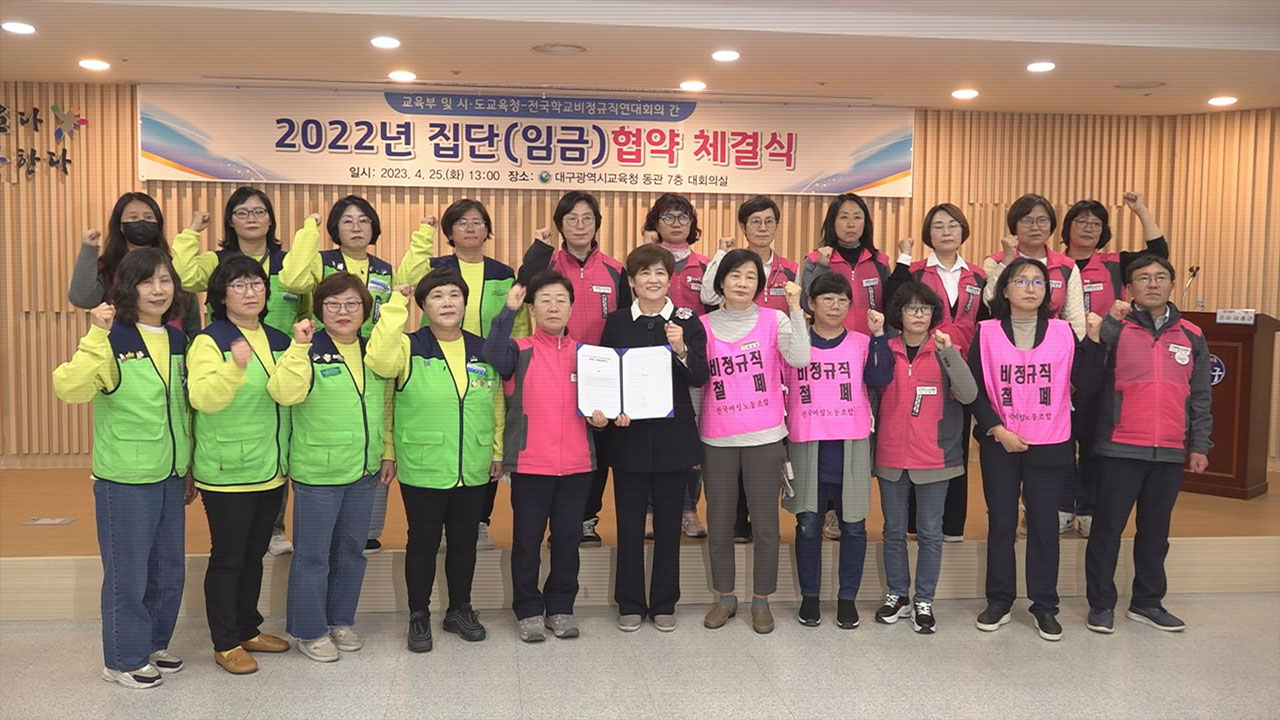 교육부와 전국 17개 시도 교육청은 대구시교육청에서 전국학교비정규직연대회의와 '2022년도 임금 협약'을 체결했습니다.