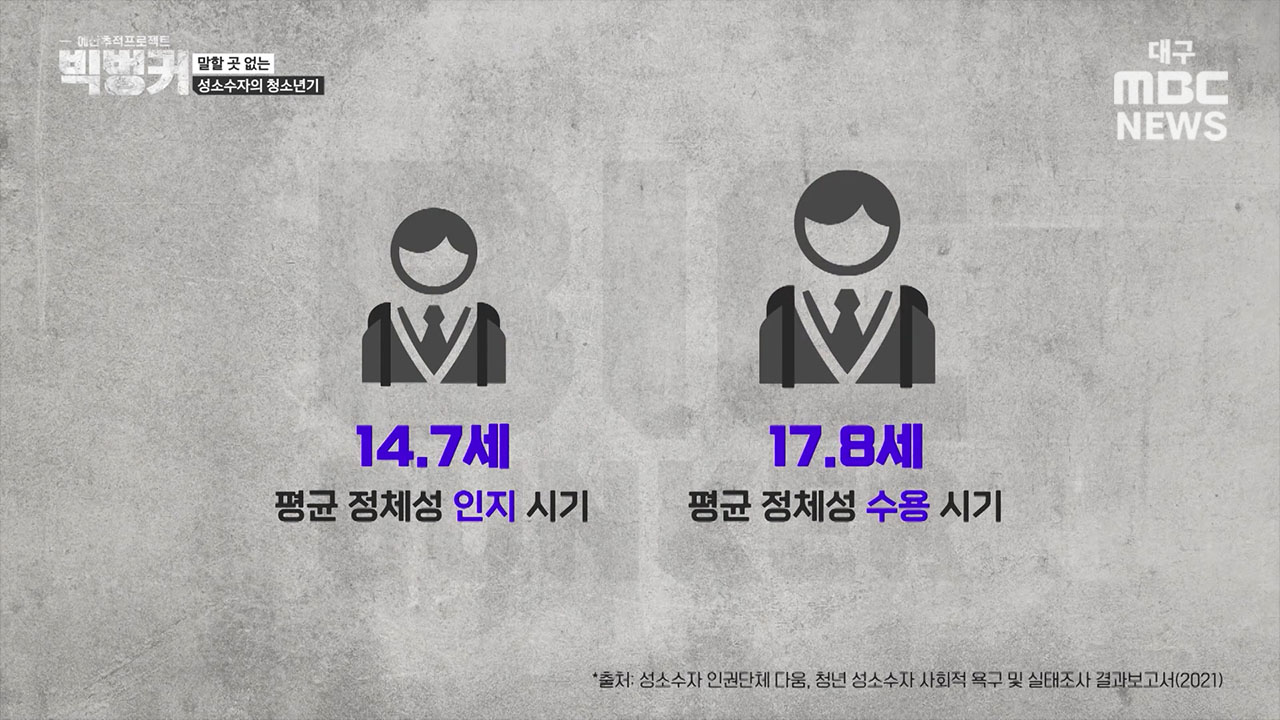 정민석 청소년성소수자지원센터 띵동 대표 "대부분의 성소수자가 청소년 시기에 자신의 성 정체성을 인지하거나 수용합니다. 성소수자 인권단체 다움에서 2021년 청년 성소수자를 대상을 실태조사를 한 적이 있는데요, 이 조사에 따르면 성소수자로서 성향을 최초로 인지한 시기가 평균 14.7세이고요, 정체성을 인정하고 받아들이게 된 시기가 평균 17.8세입니다. 그러니까 이 청소년 시기에 자신의 성적 지향과 성별 정체성에 대해서 아주 깊은 고민을 하게 되는 거죠"