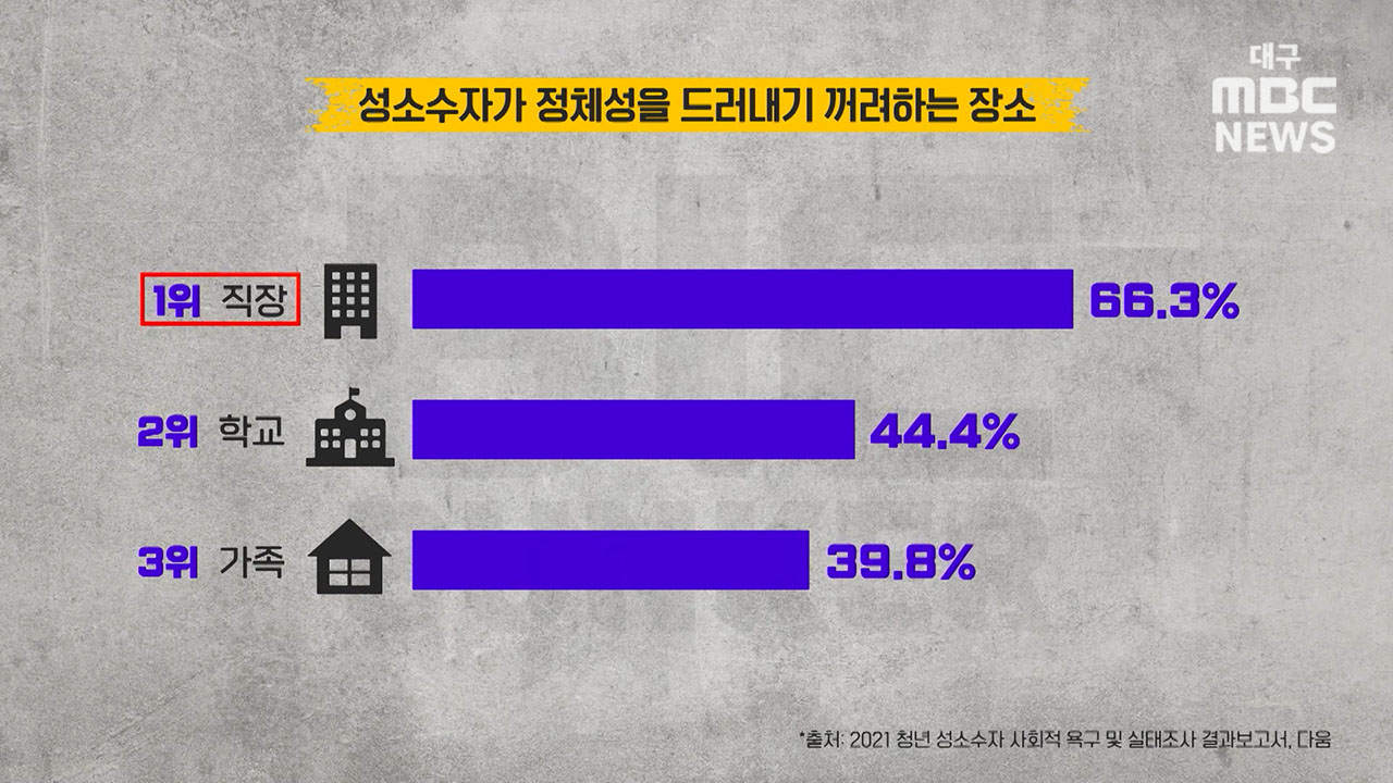 정민석 청소년성소수자지원센터 띵동 대표 "성소수자들이 직장생활을 잘하기 위해선 뭐가 가장 필요하고 도움 되겠냐 물어보니까 62%는 '커밍아웃을 할 수 있는 분위기'라고 답했는데요, 그만큼 커밍아웃을 못 하고 스스로를 숨기면서 살아가는 것 자체가 굉장한 스트레스고 폭력인 거죠. 그리고 또 50%는 성소수자 인권 침해, 차별에 대한 구제 절차나 기구가 만들어져야 한다고 말했어요. 직장에서 이런 환경이 잘 만들어져야 하는 가장 큰 이유는 생계와 직결되기 때문입니다. 특히 트랜스젠더의 경우엔 더 심각한 차별을 겪어요. 주민등록번호에 적힌 성별과 외모가 일치하지 않는다고 직장을 구하는 과정에서부터 어려움을 겪는 거죠"