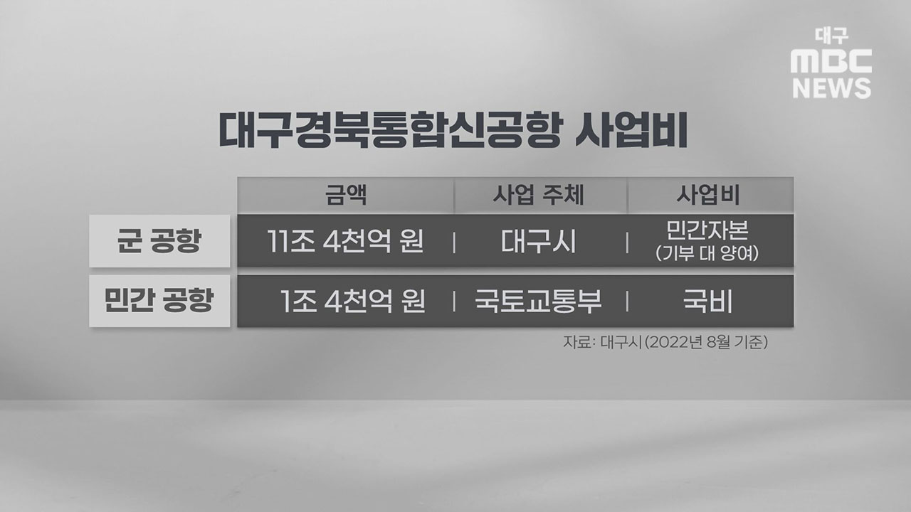 또 다른 우려는 정산 문제입니다. 가덕신공항이 완공 예정인 2029년까지 정부의 국비 지원은 재정 사업인 부산 가덕도 공항으로 갈 것이고, 대구경북신공항은 주로 군부대 이전 방식인 기부 대 양여로 추진됩니다. 그래서 정부 지원이나 정산은 공항 개항 뒤인 2031년 후로 밀릴 것이고, 결국 나중에 정산 문제가 발생할 수 있다는 말이 나오는 이유이기도 합니다.