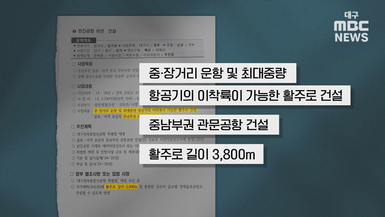 배석주 대구시 통합신공항건설본부장 "국회 논의 과정에서 해당 조항들이 법률로 정해야 할 것이냐, 정부 계획 단계에서 하는 것이 맞지 않느냐 하는 여러 가지 토론들이 있었습니다. 과거의 가덕도 사례에 비추어서도 이 부분은 법률에 정하기보다는 정부 계획 단계에서 하는 것이 맞다 해서 빠진 것이고요. 그럼에도 불구하고 법률에 규정되어 있지 않다고 하더라도 넉넉한 공항이 되고 활주로도 충분해 중대형기가 뜰 수 있도록 정부 협의를 통해서 해결할 수 있다고 보이고, 협의 중에 있습니다"