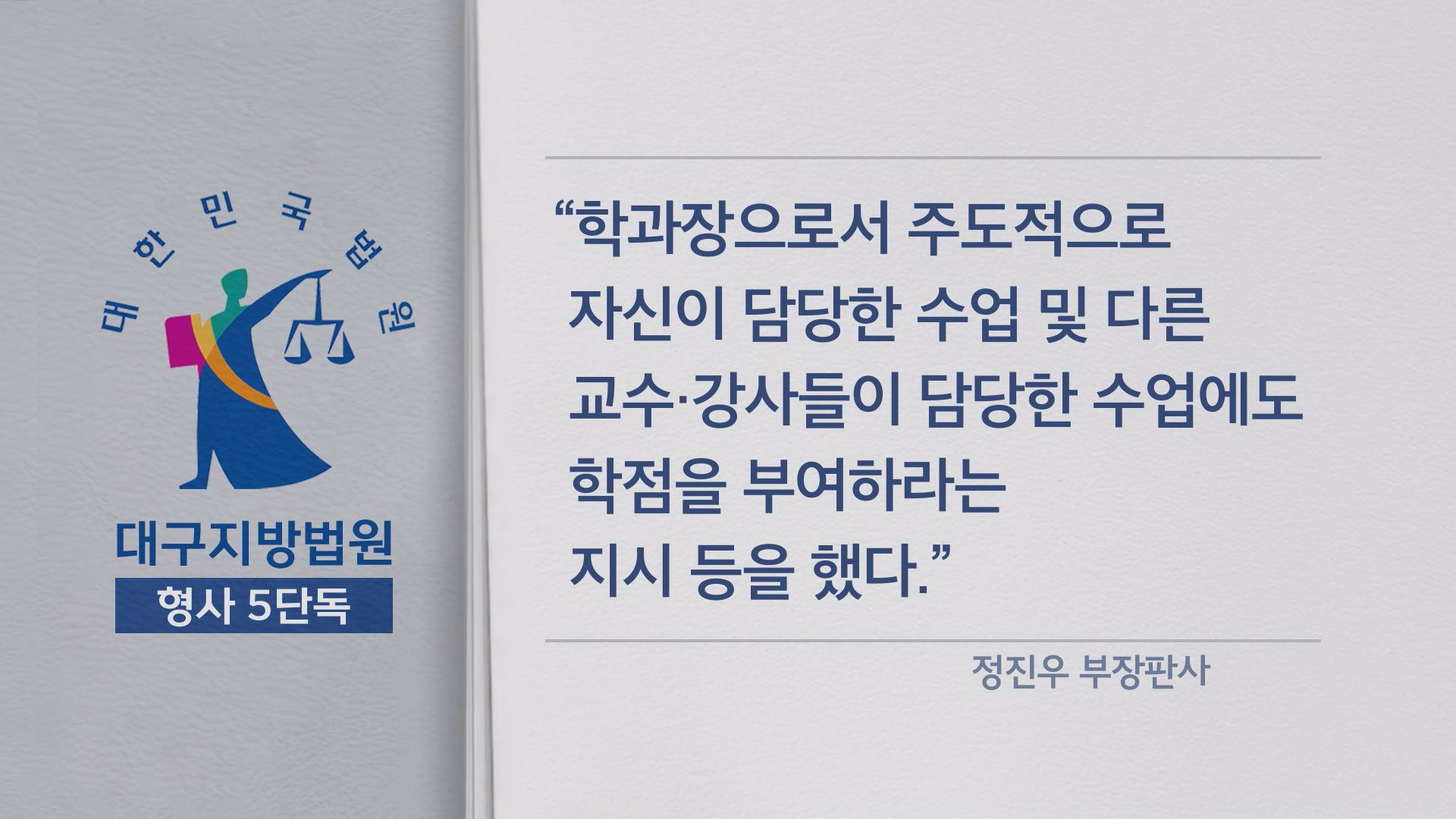 대구지법 형사 5단독 정진우 부장판사는 주도적으로 편입 여성에게 학점을 주기 위해 자신이 담당한 수업 및 다른 교수, 강사들이 담당한 수업에도 학점을 부여하라는 지시 등을 한 혐의로 전 학과장에게 벌금 천만 원을 선고했습니다.