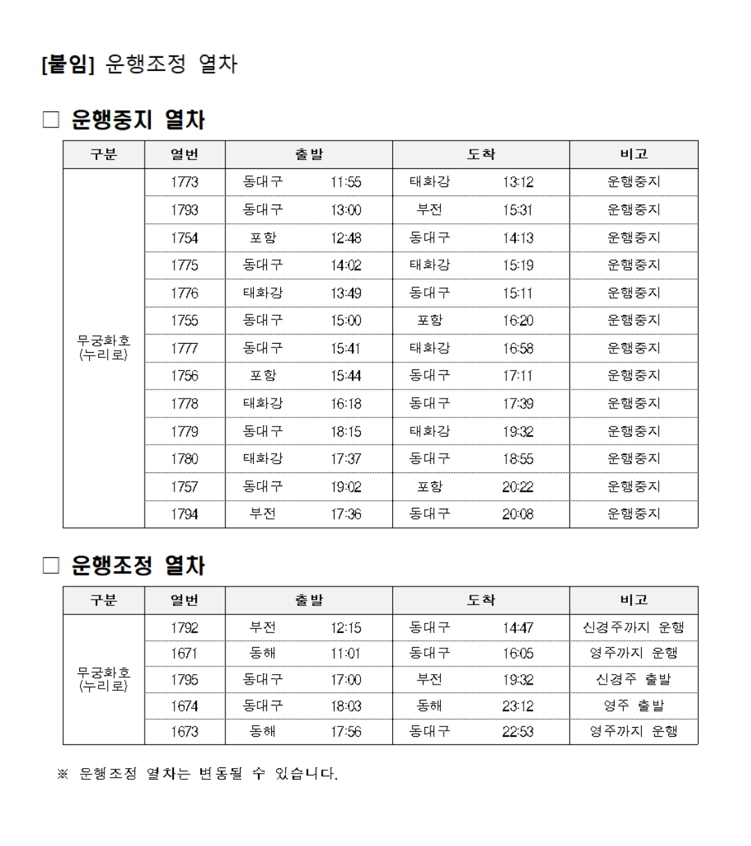 인명피해는 없었지만, 포항과 태화강 등에서 동대구를 오가는 대구선 무궁화호 10여 편의 운행이 중단됐고 부전과 동해에서 동대구를 오가는 일부 열차 운행도 조정됐습니다.