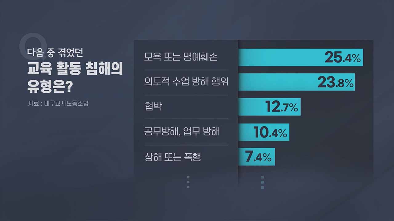 이 가운데 '의도적 수업 방해'는 최근 교육부 고시 개정으로 교권 침해의 새로운 유형으로 반영된 건데요, 어떤 사례들이 있는지 대구의 한 초등학교 교사 이야기 들어보시죠.