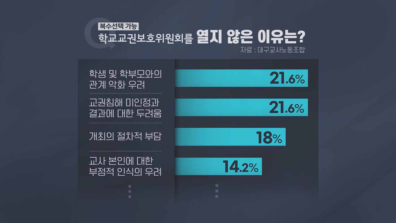 열지 않은 이유로는 '학생과 학부모와의 관계 악화 우려' 21.6% '교권 침해를 인정받지 못할 것에 대한 두려움' 21.6%, '개최의 절차적 부담' 18% '개최에 따른 교사 본인의 부정적 인식에 대한 우려' 14.2% 순이었는데요.