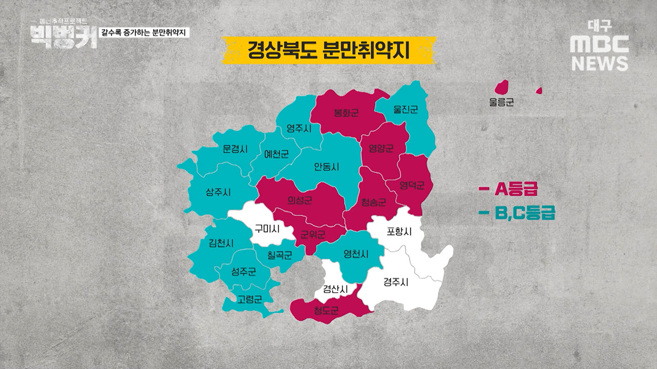 우지영 나라살림연구소 수석연구위원 "경북과 경남의 분만 취약지를 살펴봤는데요, 분만 취약지는 A, B, C등급으로 나뉩니다. 경북은 울릉, 봉화, 영양, 영덕, 청송, 의성, 군위, 청도가 가장 심각한 A등급에 속합니다. 경남의 경우는 함양군, 합천군, 의령군, 남해군 등이 A등급에 속하는데요, 통계적으로 보면 경북은 23개 시군 가운데 19곳이 분만 취약지이고, 경남은 16개 시군 중 13곳이 분만 취약지입니다. 그러니까 경북과 경남지역의 약 90%가 분만 취약지로 수치상으로도 굉장히 심각하다는 것을 알 수 있습니다"