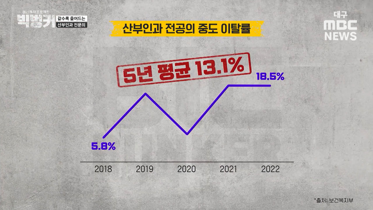 배주현 매일신문 기자 "취재를 해보면, 아이를 낳지 않으니까 산부인과를 이용하는 임산부가 줄고, 결국 산부인과 분만병원의 수입이 줄어들면서 경영상 어려움이 많다고 해요. 그래서 폐업하는 병원과 분만을 포기하는 병원도 늘었습니다. 지금 지방 소멸이라고들 하잖아요? 그렇다 보니 저출생으로 인한 직격탄을 지방이 가장 먼저 맞고 있는 상황인 거죠. 분만 가능한 산부인과 병원 수도 2014년 1,311곳에서 2021년 481곳으로 3분의 1 정도가 줄어들었고, 분만 병상수도 2014년 2,773개에서 2021년 2,064개로 7백 개 이상 줄어든 상황입니다"