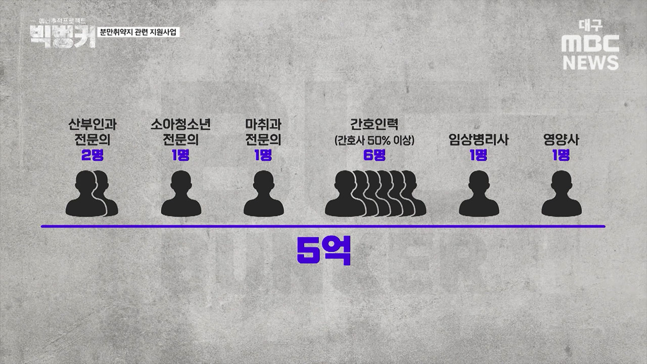 우지영 나라살림연구소 수석연구위원 "분만 취약지 관련 예산 중에 지역 분만병원 관련 지원 사업이 있는데요, 분만 산부인과 당 운영비 5억 원을 지원합니다. 그런데 문제는 운영비 지원 조건이 비현실적이라는 겁니다. 운영비를 지원받으려면 산부인과 전문의 2명, 소아청소년과 전문의 1명, 마취과 전문의 1명, 간호 인력 6명, 임상병리사 1명, 영양사 1명 등의 의료 인력을 갖춰야 하는데 출생률이 점점 줄어드는 상황에서 5억 원이라는 지원금으로는 이 인력을 계속해서 유지하기 힘들고, 거기다 이 인력 조건을 갖추는 것조차도 힘든 상황입니다"