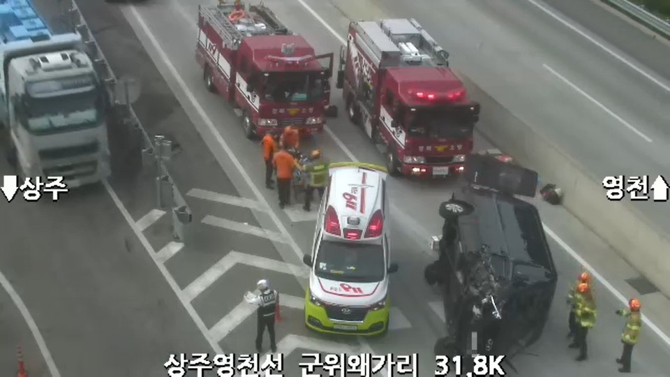 5월 27일 오전 7시 반쯤, 경북 군위군 소보면 상주영천고속도로에서 상주 방향으로 달리던 15인승 승합차가 가드레일을 들이받은 뒤 넘어졌습니다.