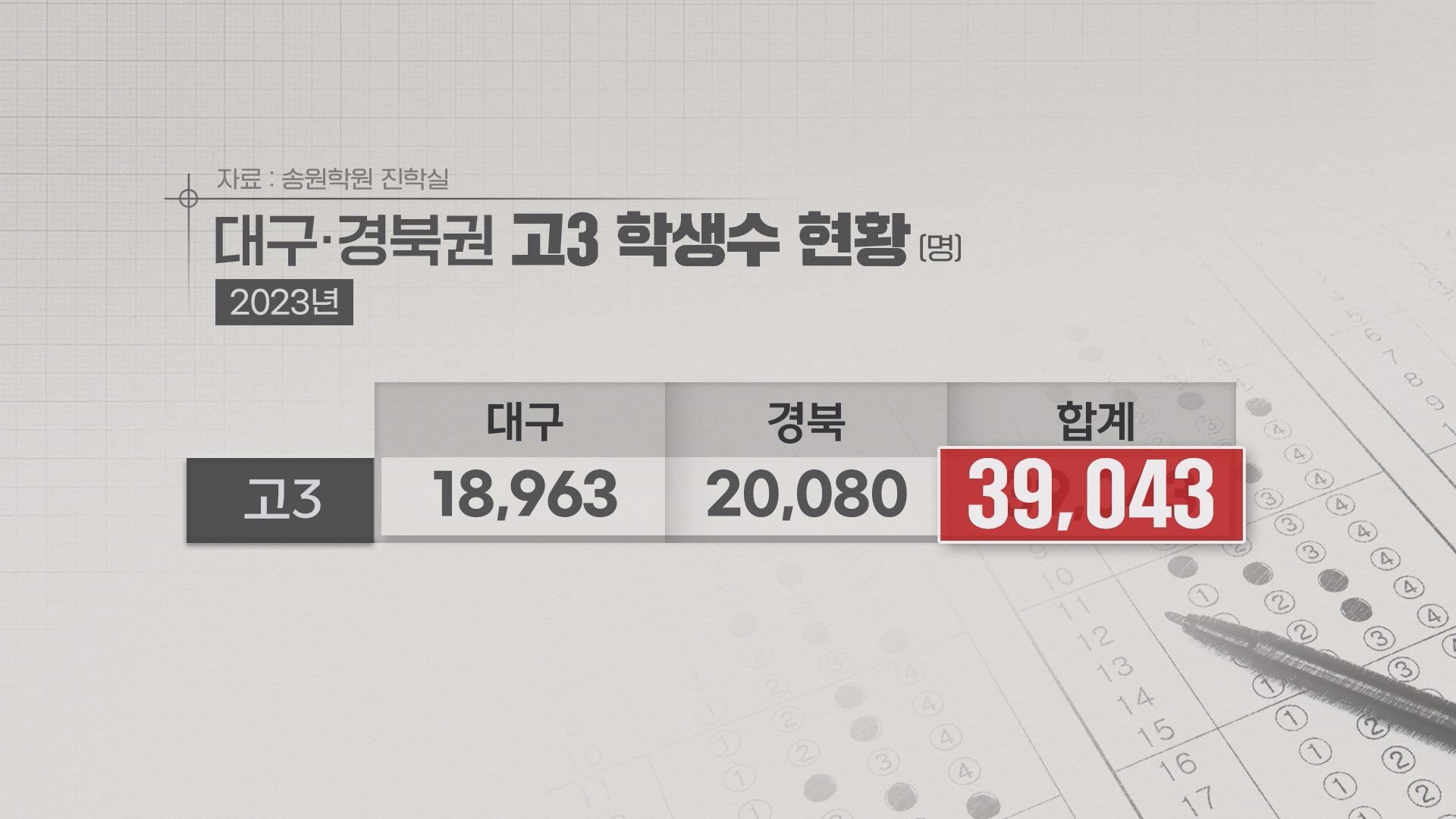 대구 입시학원인 송원학원에 따르면 2023년 대구·경북지역 고등학교 3학년 학생은 대구 만 8,900여 명, 경북 20,000여 명 등 39,000여 명입니다.