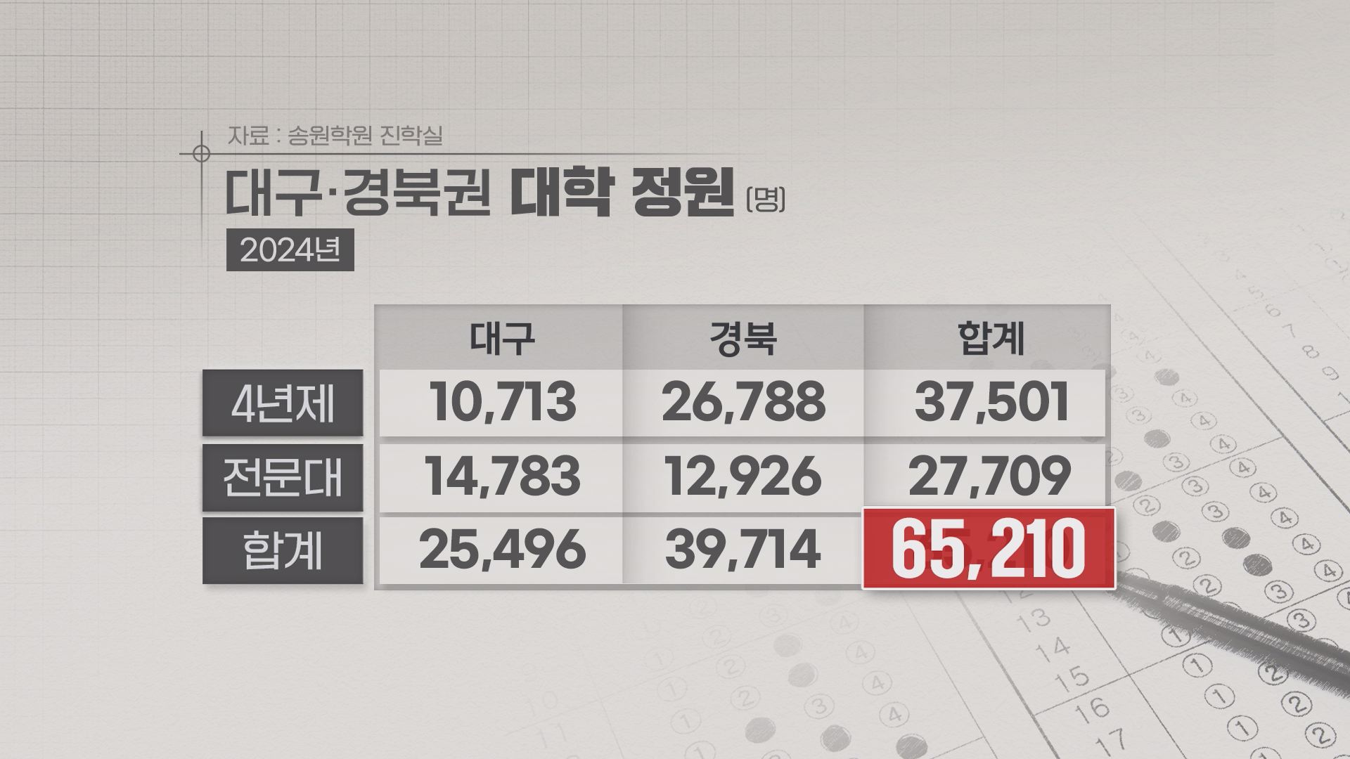 반면 2024학년도 대구·경북지역 대학들의 신입생 정원은 4년제 대학교 37,000여 명, 전문대학교 27,000여 명 등 65,000여 명에 이릅니다.