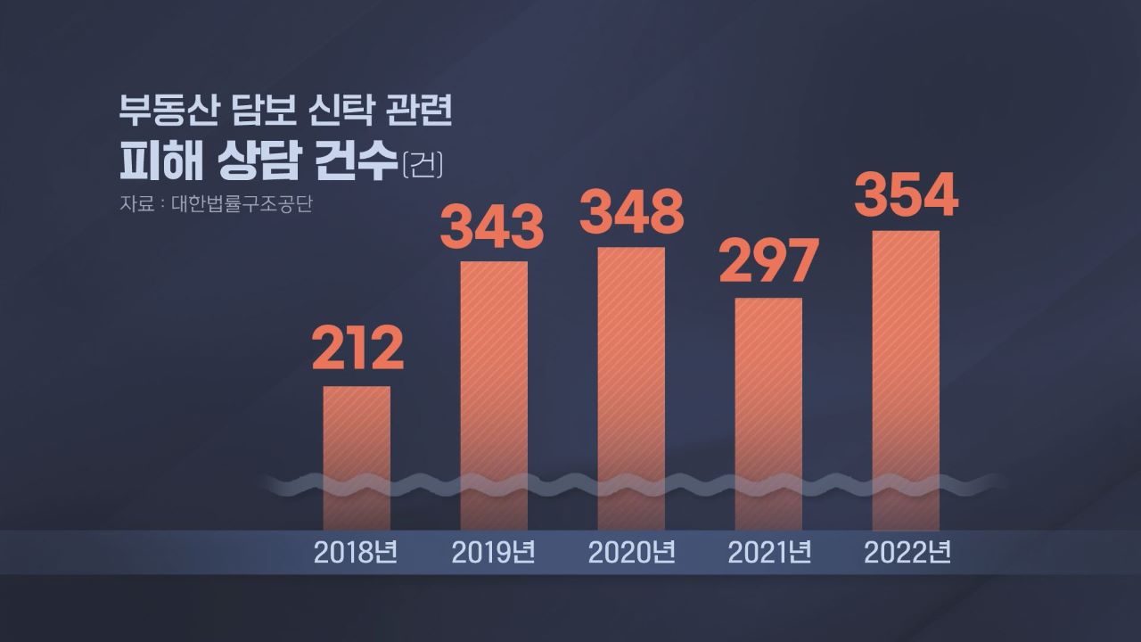 대한법률구조공단에 따르면 부동산 담보 신탁과 관련한 피해 상담 건수는 2018년 212건, 2019년 343건, 2020년 348건, 2021년 297건, 2022년 354건으로 2021년을 제외하면 매년 늘고 있습니다.