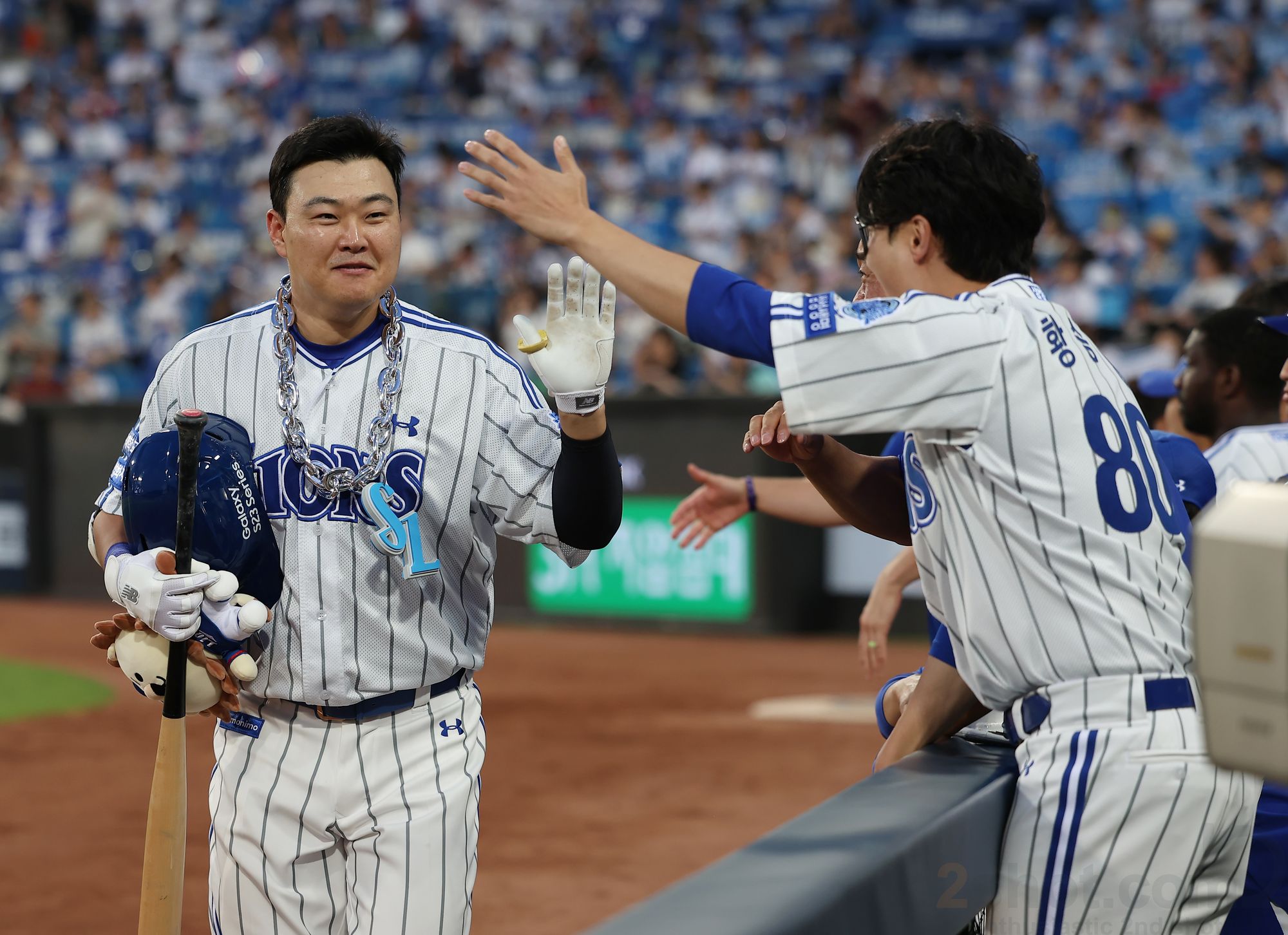전날 홈런을 기록한 오재일과 김현준이 강민호의 조언 덕에 홈런을 기록했다는 지점에 대해서 강민호는 '훈련 때 다른 모습이 나와 쩍 이야기했을 뿐 내가 한 건 없다'며 미소를 지어 올라간 팀 분위기를 보여줬습니다.