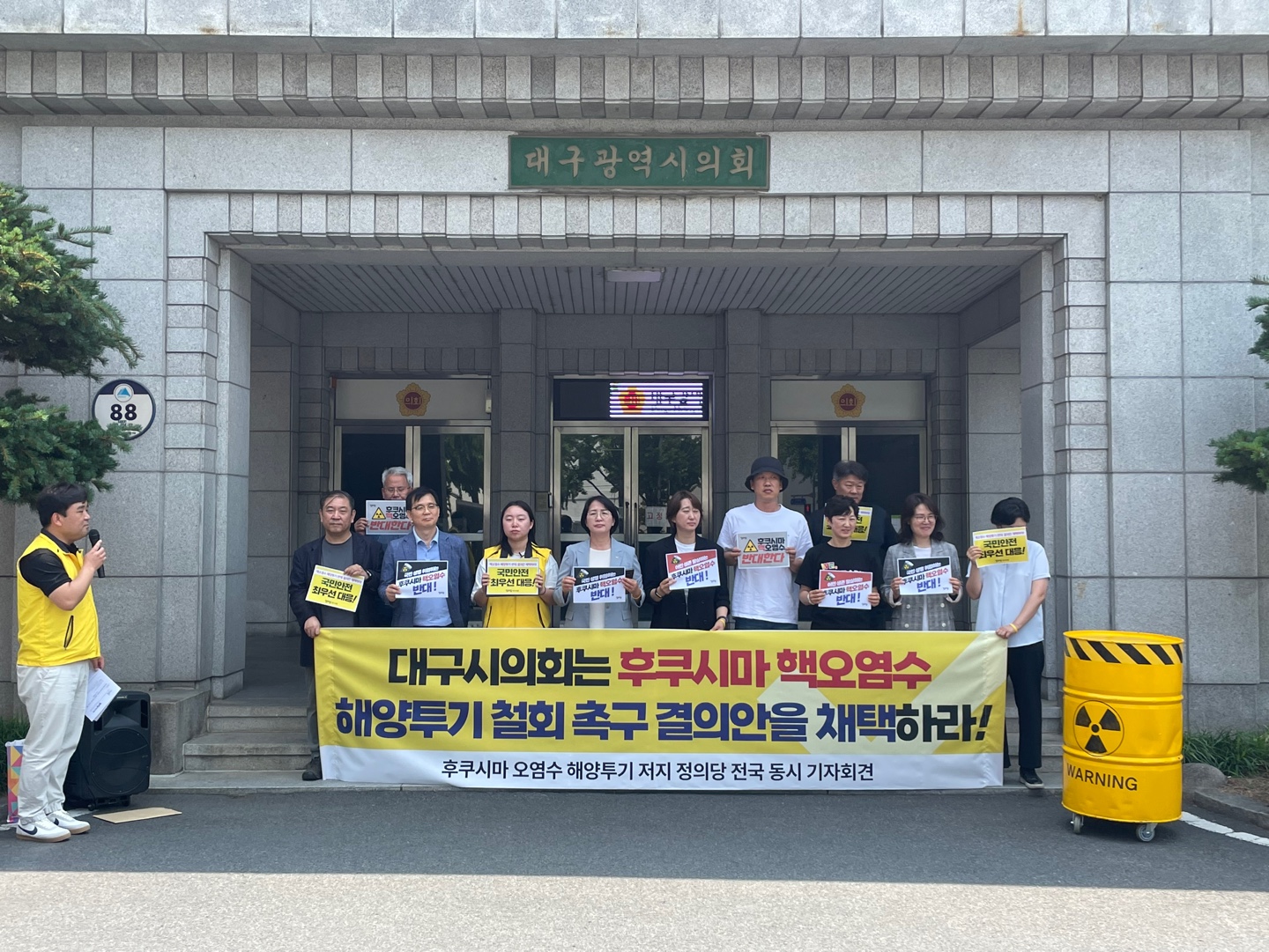 정의당 대구시당은 6월 14일 대구시의회 앞에서 기자회견을 열고, 시의회에 "후쿠시마 핵 오염수 해양 투기의 철회를 촉구하는 결의안을 채택하라"고 요구했습니다.
