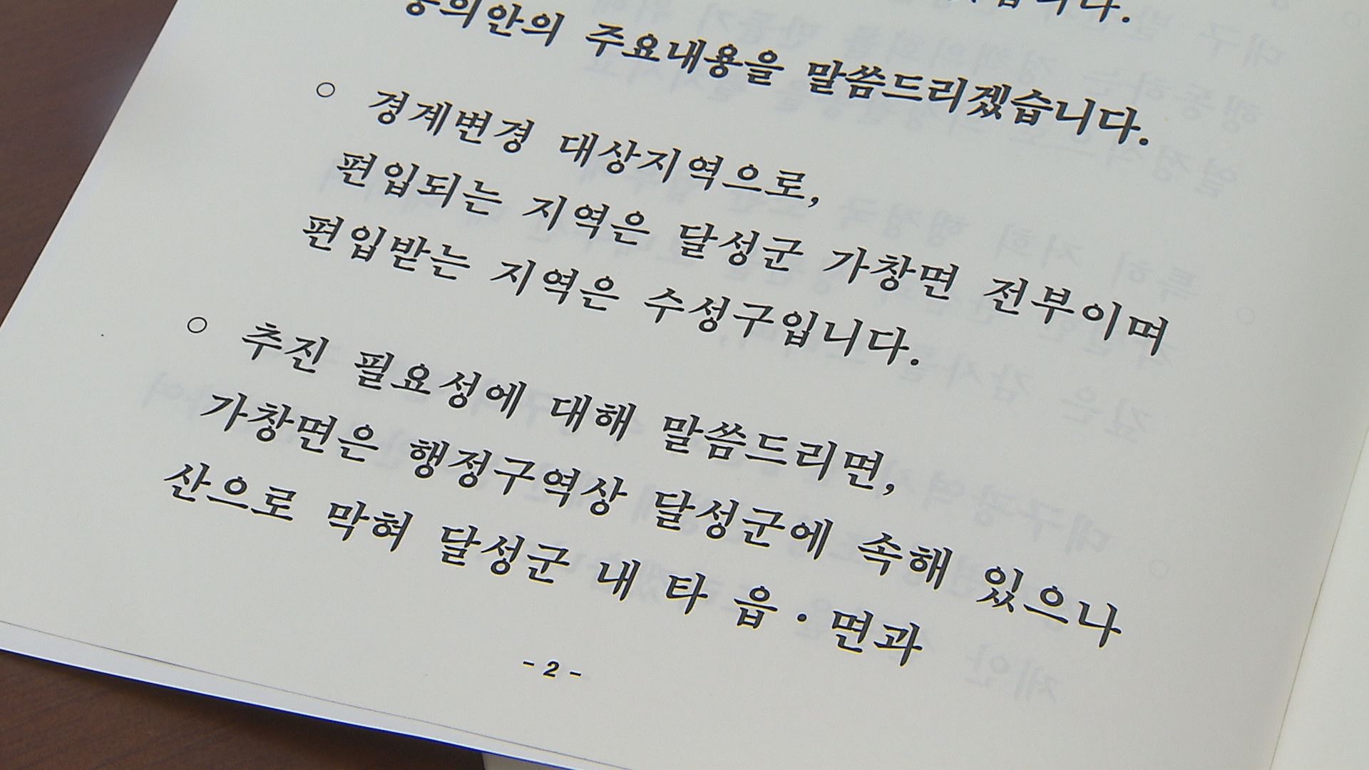 표결에 앞서 대구시 행정국장은 관할구역과 생활권을 일치시키기 위해 가창면의 수성구 편입이 필요하다고 강조했습니다.