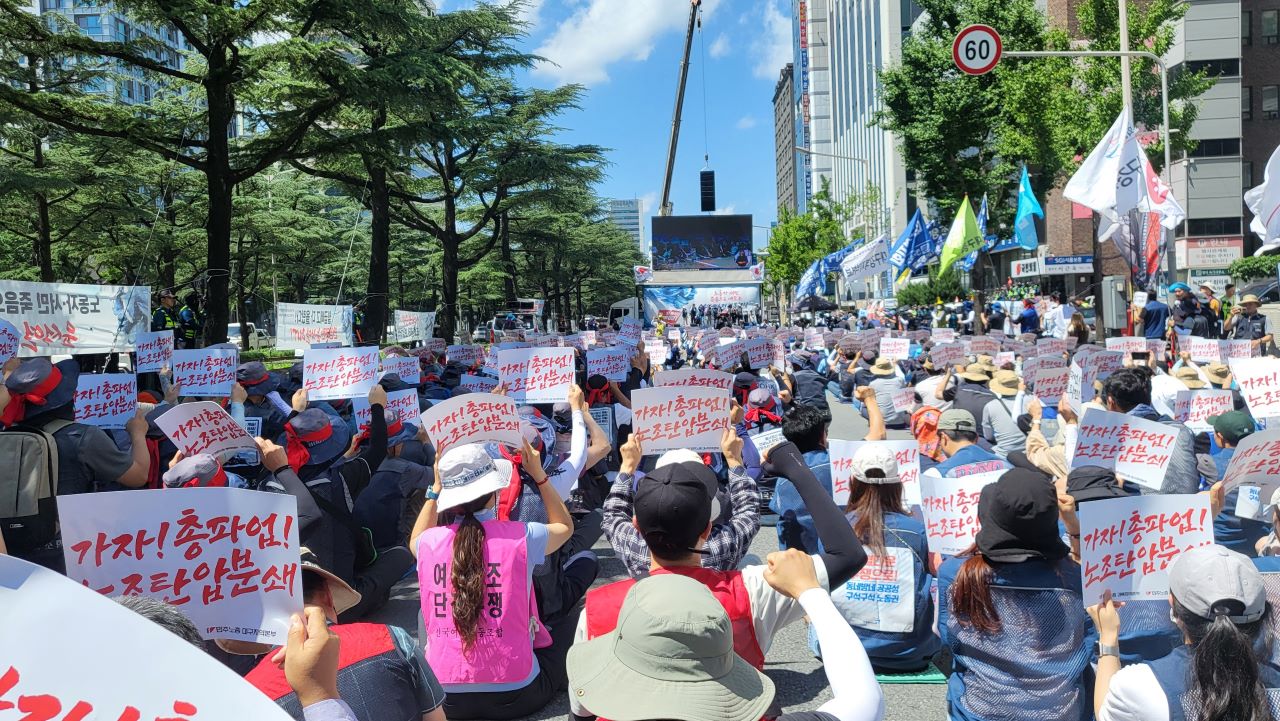 민주노총 대구·경북 본부는 윤석열 정권의 퇴진을 요구하며 7월 5일 국민의힘 대구시당 앞에서 주최 측 추산 천여 명이 참석한 가운데 총파업 승리 결의대회를 열었습니다.