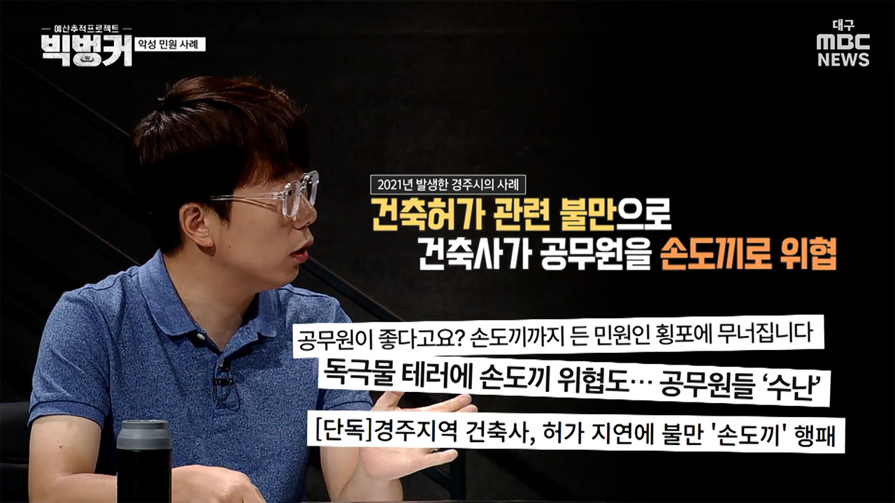 이상원 뉴스민 기자 "2021년 10월 경주시청에서는 건축허가 지연 이유로 건축사가 손도끼로 공무원을 위협한 일도 있었어요. 또 1년간 상점 불법 간판 및 광고물 관련 민원을 7,400여 건 제기한 민원인도 있었거든요? 이렇게 계속 반복적인 민원 제기 등으로 공무원들의 정신적 학대, 업무 마비를 초래할 정도로 과다한 업무를 강요하는 사례도 악성 민원에 포함됩니다"