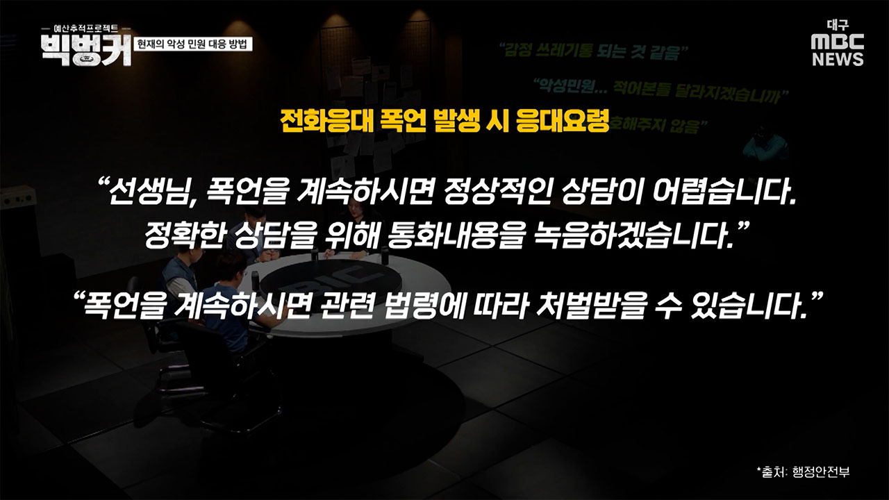 추승진 전국공무원노동조합 부산지역본부 정책부장 "실제로 애매한 경우도 있어요. 범법 행위의 경계에 있는 악성 민원도 많은데, 예를 들어 물건을 발로 찬다거나 서류를 얼굴에 던지고 혼잣말하듯이 욕설하는 등의 행위가 되겠죠. 폭행도 종종 벌어지고 있지만 악성 민원의 절대다수는 폭언과 욕설이거든요? 법과 제도가 있지만 폭언과 욕설은 처벌 수위가 낮고 거기다 인사 고과 등에서 불이익을 받을 수도 있으니까 피해 공무원은 그냥 좋게 좋게 해결하려는 경우가 많죠"