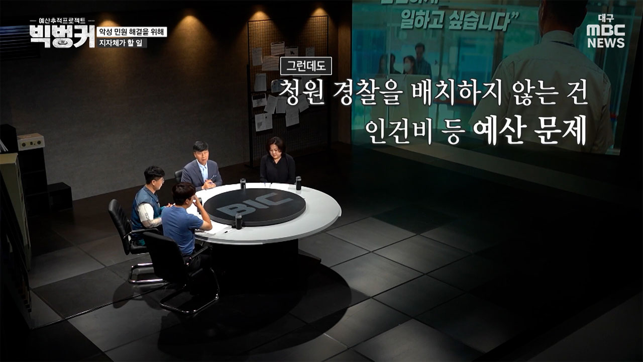 우지영 나라살림연구소 수석연구위원 "행정안전부의 민원 처리 담당자 보호 및 지원에 관한 참고 자치법규 안을 보면 제7조 8항에 청원경찰, 방호원 등 안전요원 배치가 적혀 있거든요? 지자체는 이 참고 자치법규에 따라 조례를 만들어야 합니다. 물론 참고이기에 반드시 똑같아야 하는 건 아니지만 이걸 근간으로 조례를 만들어야 하거든요? 그런데 대구와 부산 지역의 조례를 살펴봤더니 상당수 이 조항이 빠져 있어요. 대구는 서구, 동구, 북구, 수성구에서 항목이 없고 부산은 18개 시군 중 서구, 북구, 사하구, 부산진구, 기장군 등 5곳을 제외한 나머지 13개 시군 모두 안전 요원 항목을 찾아볼 수가 없어요. '업무 지원해야 한다' '예산 배정해야 한다' 이런 식으로 적힌 건 하지 않겠단 이야기죠. 인건비가 많이 드니까 슬그머니 뺀 거고, 이렇게 조례도 없고 예산도 없으니 지자체의 의지가 없다는 방증인 거죠"
