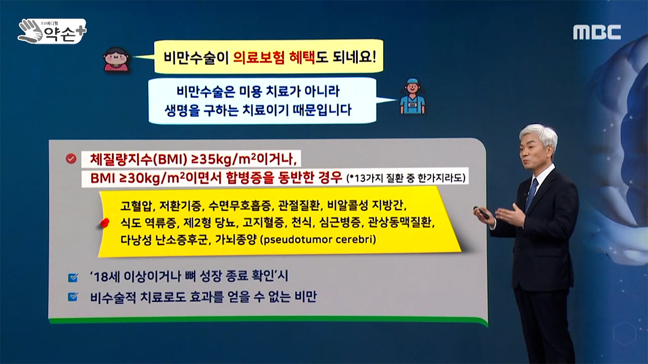 그렇지만 그 환자가 18세 이하의 고등학생이라든지 성장기에 있는, 뼈 성장이 아직 멈추지 않은 환자들 같은 경우에는 보험이 적용되지 않고 또 비수술적 치료. 그러니까 "무조건 나는 수술 받을래"라고 해서 와서 받을 수 있는 것이 아니라 비수술적 치료, 약물치료라든지 생활 습관 치료를 하고 난 다음에도 그것으로써도 도저히 되지 않는 경우, 요요가 되는 경우에는 수술적 치료를 보험에 적용할 수가 있는 것입니다.
