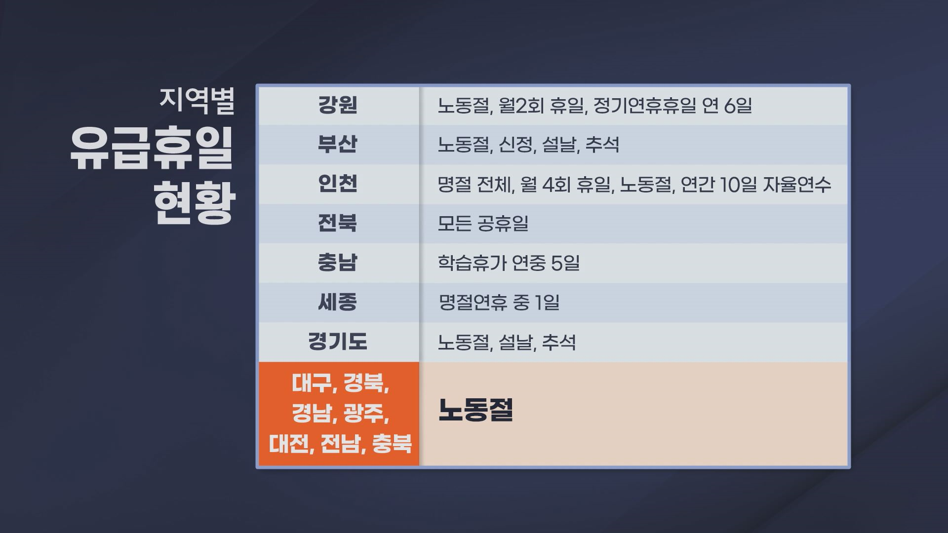 그런데 대구, 경북, 경남, 광주, 대전, 전남, 충북 등 7개 교육청은 노동절 하루만 유급휴일로 규정하고 있어 같은 일을 하면서도 지역별로 큰 차이가 나는 것으로 나타나고 있습니다.