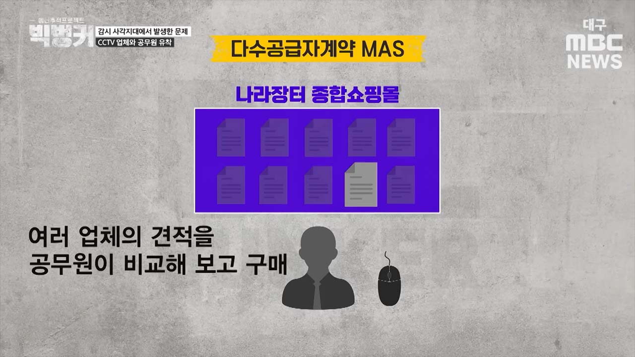 천용길 뉴스민 기자 "마스(MAS)는 다수 공급자 계약으로, 나라장터 종합쇼핑몰에서 이루어지는 계약입니다. 조달청이 3개 이상의 기업과 단가 계약을 체결해 놓으면 공공기관이 별도의 계약 체결 없이 나라장터 쇼핑몰을 통해 물품을 쉽게 구매하는 제도죠. 방송 장비를 예로 든다면 방송 장비를 만드는 여러 업체가 있을 거 아니에요? 그 업체들이 공사, 물품 등에 대한 정보를 올려놓으면 공무원들이 제품 견적을 비교해 보고 알맞은 거로 구매하는 거죠. 1대 1 계약이 아니라 여러 업체가 후보군에 있으니 보다 공정하게 계약이 이뤄진다는 취지로, 수의계약이랑 완전히 다른 게 아니냐고 생각할 수도 있는데요, 마스, 즉 이 나라장터 종합쇼핑몰 사이트에 등록된 물건은 입찰 절차 없이 담당 공무원이 제품만 선택하면 관급 계약이 체결되는 거거든요? 사실상 수의계약이라고 볼 수 있죠"