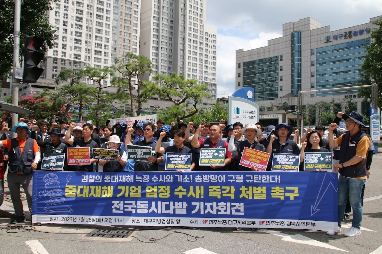 민주노총 대구·경북지역본부는 7월 25일 대구지검 앞에서 기자회견을 열고 검찰이 중대재해 기업에 대해 늑장 수사와 기소, 솜방망이 구형으로 일관하고 있다며 규탄했습니다.