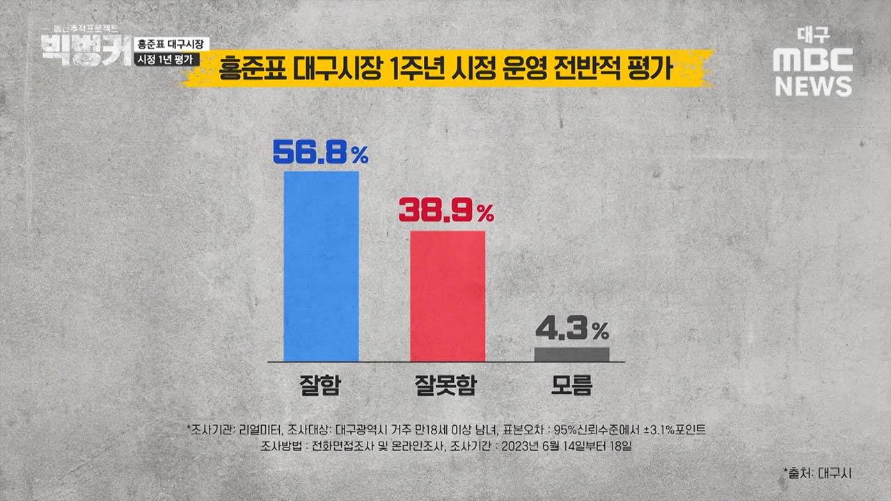 대구시는 민선 8기 출범 1주년을 맞아서 여론조사 전문 기관인 리얼미터를 통해서 대구 시민 천 명에게 물었는데요, 시정 운영 전반적인 평가를 묻는 질문에 응답자의 56.8%가 '잘하고 있다'라고 답을 했습니다. 이에 비해 '잘못한다'는 부정적인 평가는 38.9%가 나왔습니다. 이 결과만 보면 긍정적인 답변이 많아서 잘한 것으로 보이지만, 출범 100일을 맞아 시행한 정책평가와 비교해 보면 짚어볼 부분이 있습니다.