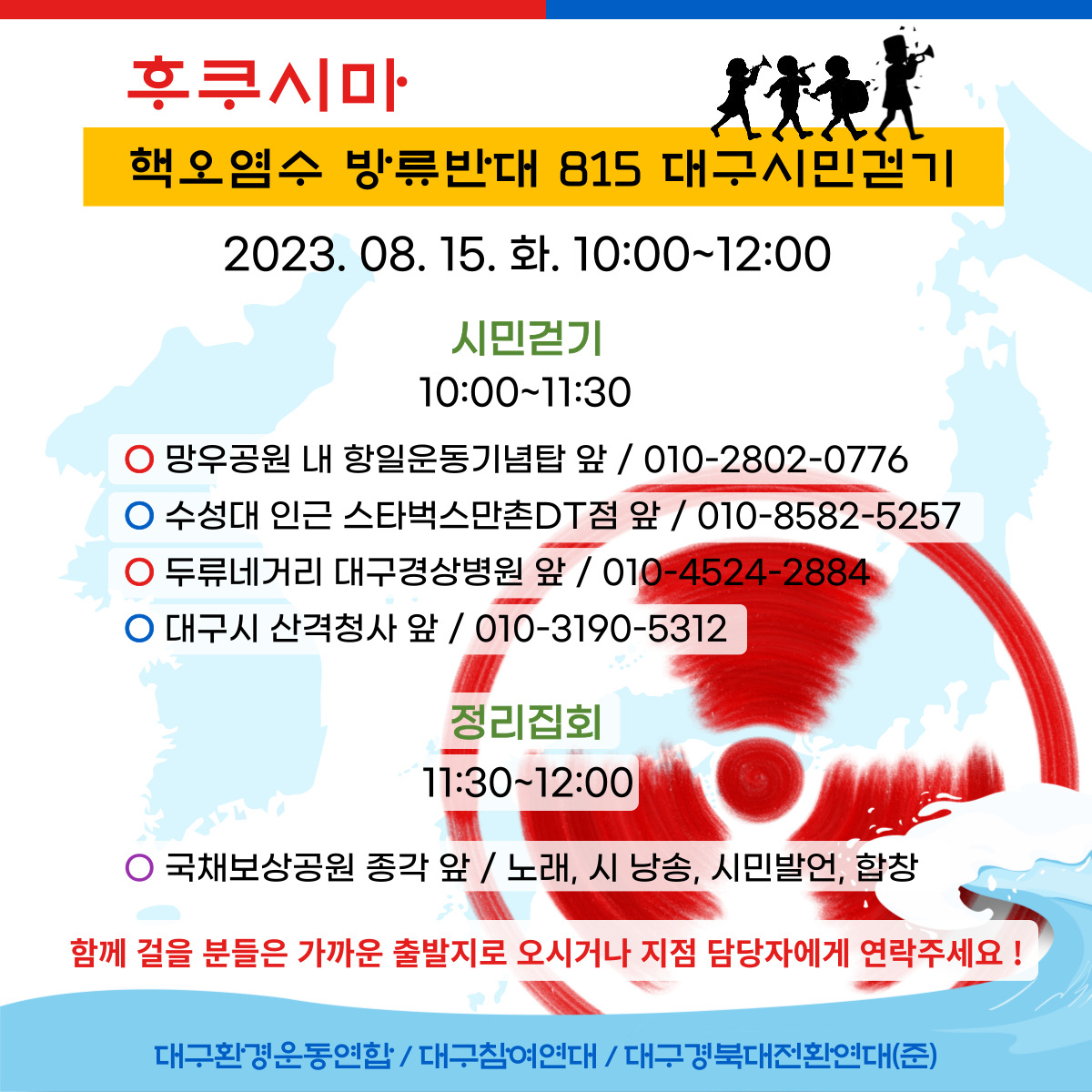 대구지역 시민사회단체들은 8·15 광복절을 맞아 8월 15일 오전 '후쿠시마 핵 오염수 방류 반대 815 대구시민 걷기' 대회를 엽니다.