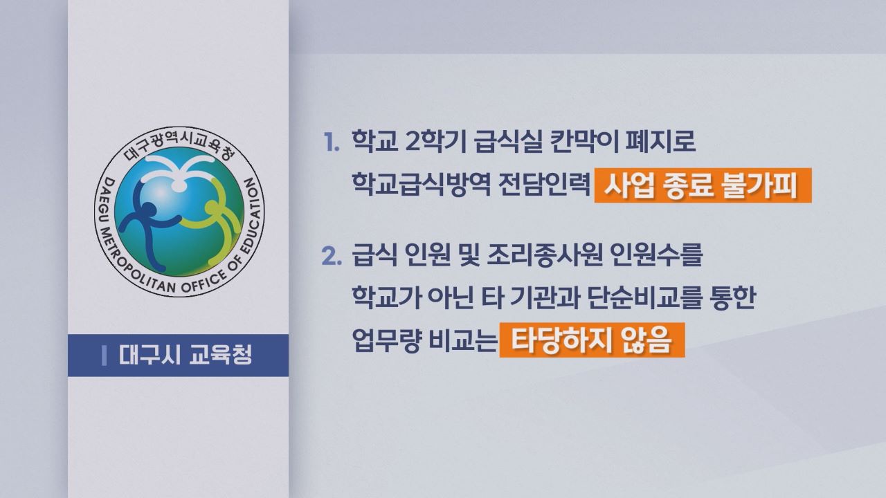 대구시교육청은 학교급식 방역 전담 인력 사업은 2학기 급식실 칸막이 폐지로 종료가 불가피하다고 밝혔습니다.