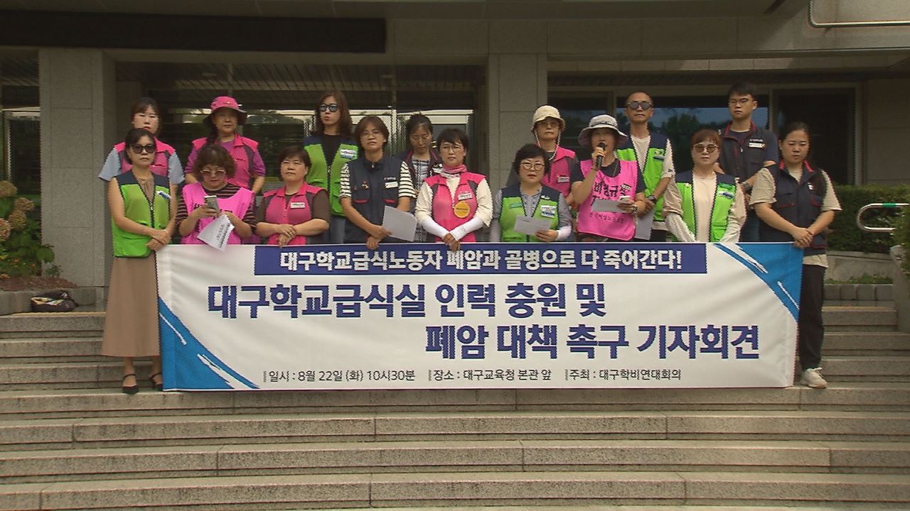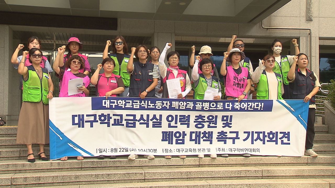노조는 골병드는 학교 급식실 근무 환경을 개선하기 위해 정기적인 노사협의체를 구성할 것을 요구하고 있지만 대구시교육청은 원론적 입장만 반복하면서 갈등의 골이 깊어지고 있습니다.