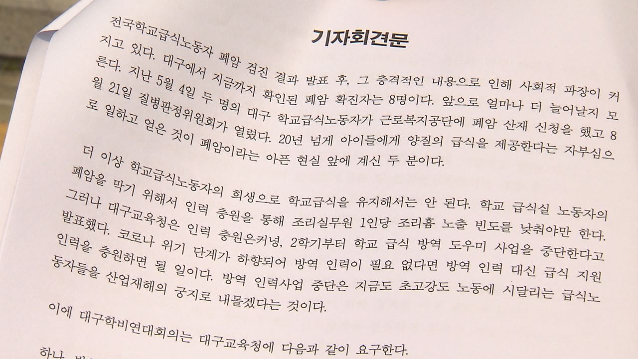 노조는 대구교육청과 배치기준에 조리실무원만 포함한다고 이미 합의한 바 있다며 배치기준을 적게 보이도록 할 것이 아니라 노동조합이 제시한 대로 인력을 충원해 배치기준을 전격적으로 하향해야 한다고 주장하고 있습니다.