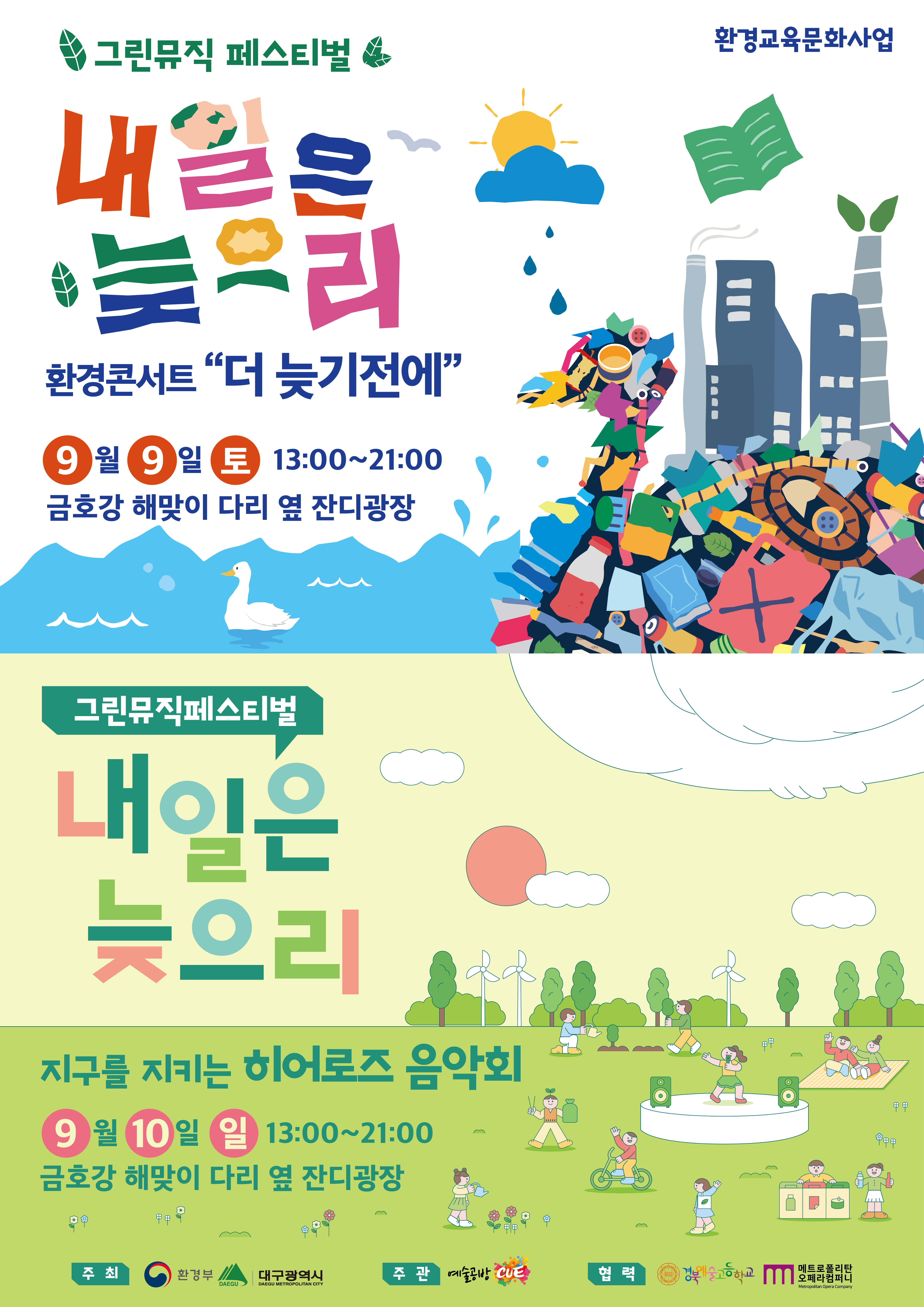환경부가 주최하는 '2023 환경 교육 문화 사업'의 하나로 그린 뮤직 페스티벌 '내일은 늦으리'가 9월 9일부터 10일까지 이틀 동안 대구 동촌 해맞이 다리 옆 잔디광장에서 펼쳐집니다.