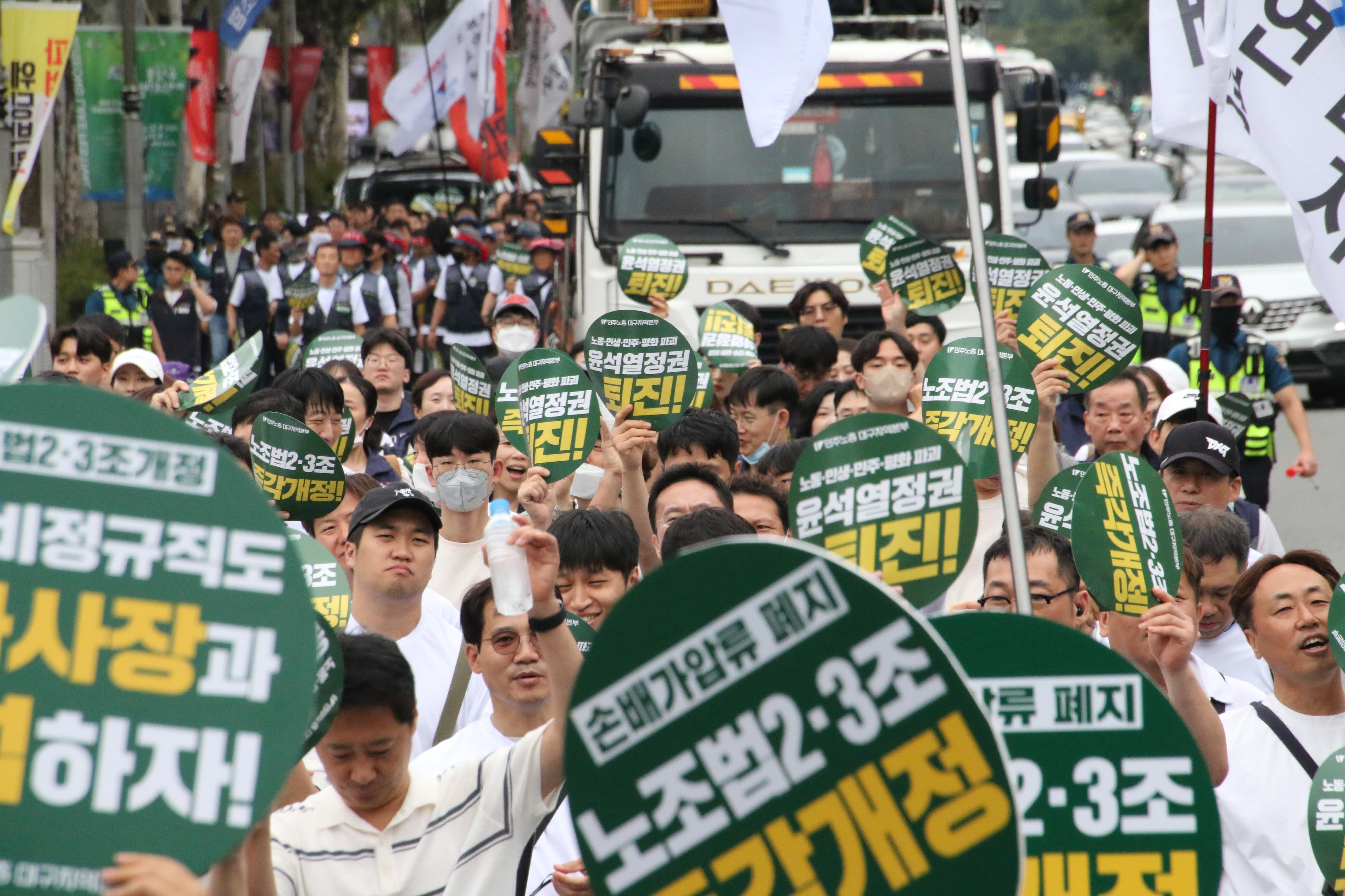민주노총은 노동 개악 반대와 철도 민영화 중단 및 공공성 강화, 노조법 2·3조 개정안 국회 통과 등을 요구하고 있습니다.