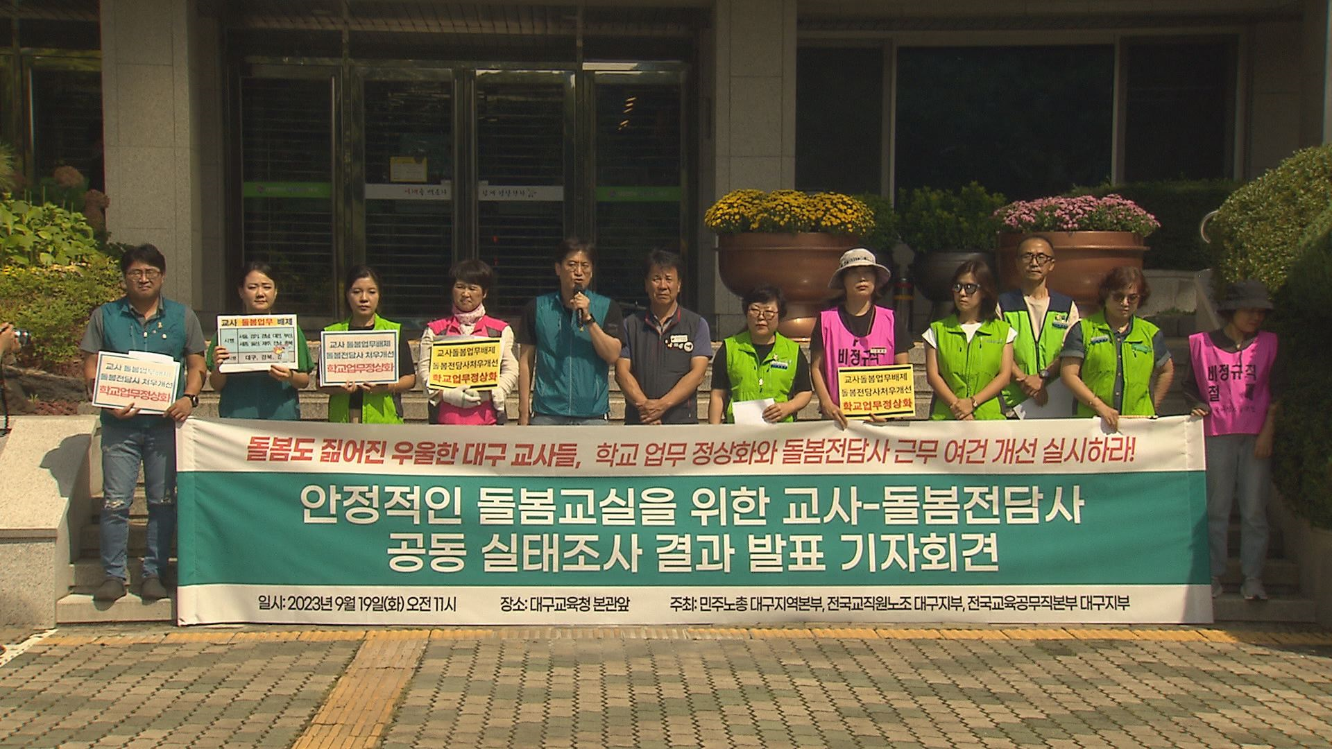 2024년부터 돌봄교실을 연장 시행하는 늘봄학교로 추진되는 상황에서 서울, 경기, 부산 등 전국 대다수 교육청이 교사의 돌봄 업무 배제와 돌봄전담사 근무 시간 확대를 시행하거나 합의하고 있지만 대구교육청은 이 같은 요구를 무시하고 있다고 주장했습니다.