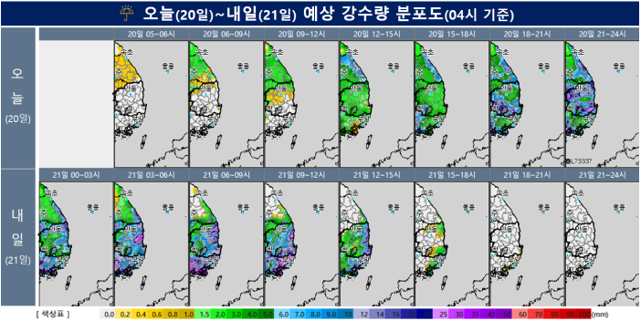 ▶ 예상 강수량(20~21일) 대구, 경북, 울릉도, 독도 : 30~100mm