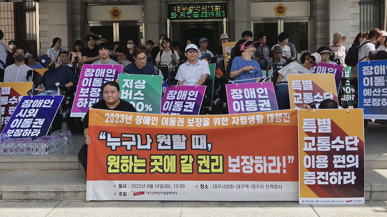 대구장애인차별철폐연대가 이동권을 보장하라며 9월 19일 대구시청에서부터 행진을 했습니다. 대구에서 장애인이 이동하기는 쉽지 않은 상황인데요. 통계를 살펴보면 다음과 같습니다. 대구에 운행하는 시내버스는 1,566대이고, 이 가운데 저상버스는 44%로 절반에 미치지 못합니다. 이른바 장애인 콜택시로 휠체어에 탑승한 채 이동할 수 있는 특별교통수단은 199대로 법정 대수 216대에 미치지 못합니다.