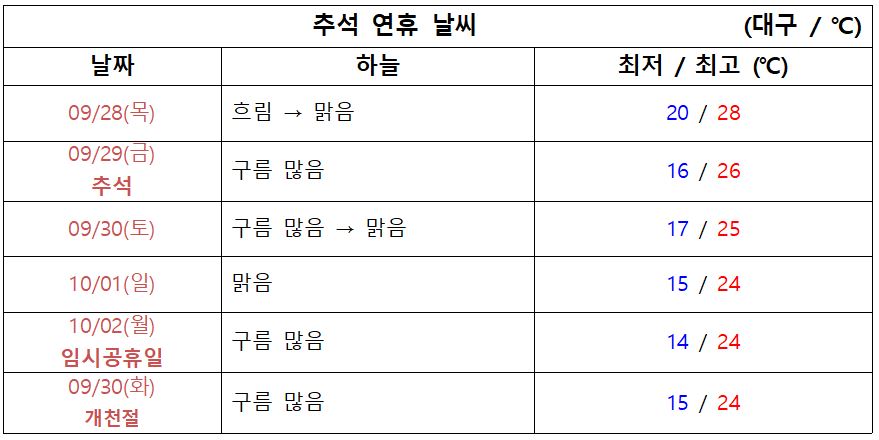 그럼 추석 연휴 기간 대구·경북 '날씨 체크'하고 가세요.