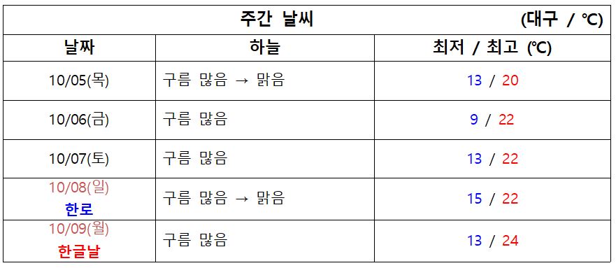다음 주 월요일 한글날에도 구름 많은 가운데 평년 수준 이어지며 일교차가 크겠습니다.